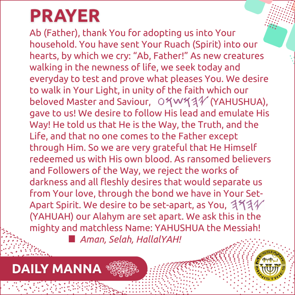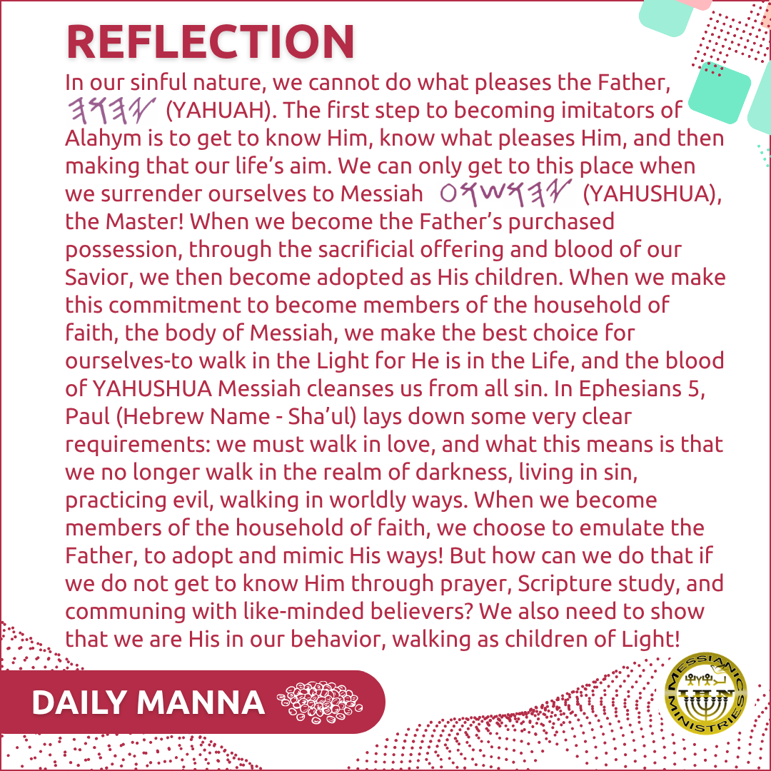 May you take full advantage of this blessing bestowed upon us as BELOVED children of the Most High YAH! Because you accept the offer to come into the fold, you become His BELOVED CHILD! Nothing will be able to separate you from His love! (Rom 8:35) There is, therefore, no condemnation for them who are in Messiah (Rom 8:1)!!! Walk in the Light! That’s where He resides, and that’s where You’ll meet Him face to face.