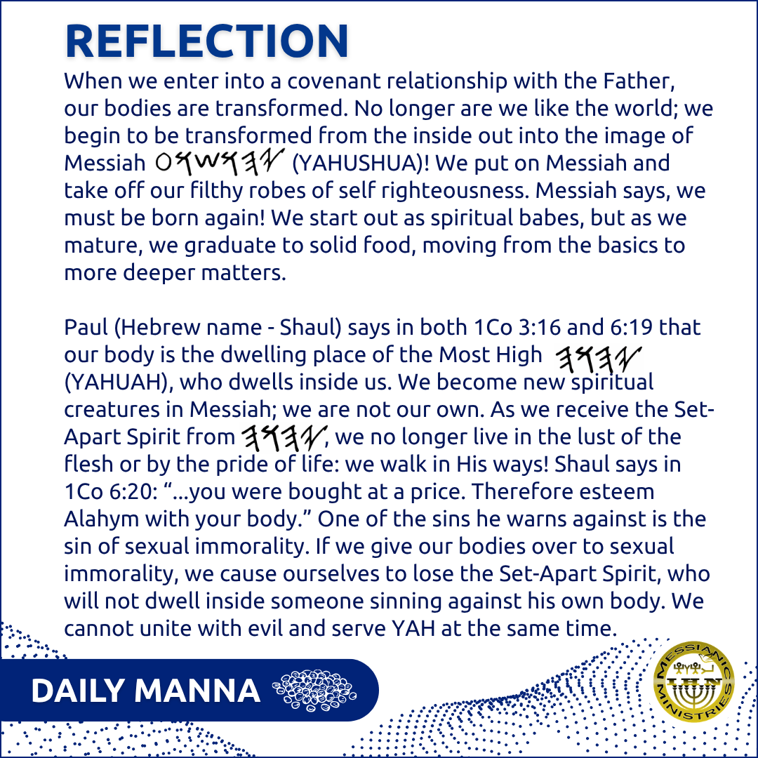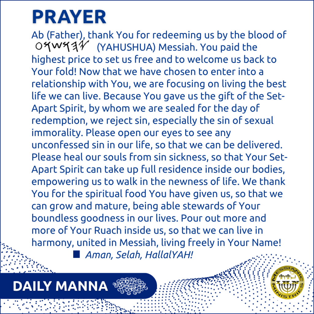The Father calls us to be set apart as He is set-apart (Lev 19:2). He goes on to say in Lev 20:26: “And you shall be set-apart to Me, for I 𐤉𐤄𐤅𐤄 am set-apart, and have separated you from the peoples to be Mine.”
