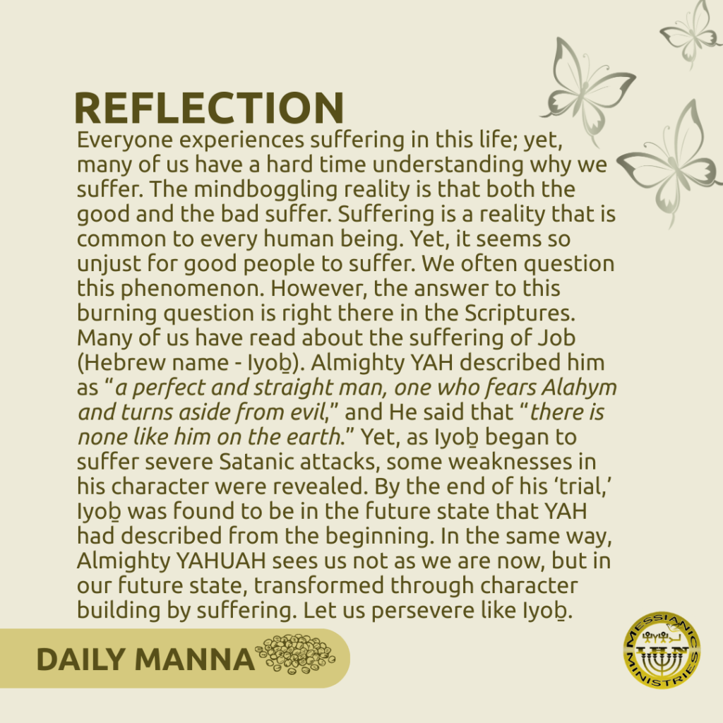 We all experience suffering in this life—even while pursuing the blessed life in Messiah. Many ask why the Father allows suffering, but the Scripture makes it plan: that suffering is necessary to build our character and to give us hope of that sure promise, that in the kingdom of YAH, suffering shall cease. Satan uses suffering to try to break our faith, and he tries to use these situations to make us so despondent that we despise our life and give in to the lie that the Father has turned His back on us! Whenever we find ourselves on the borders of despair, let us remember that YAH promised, He will NEVER fail us nor forsake us. Job was tempted to curse YAHUAH because of his suffering, and by doing so, give up his eternal crown. Job did not fall for the enemy’s tactics, and he continued to stay faithful to the end. After enduring trial, he received a special blessing: the Father multiplied him. Better than restoring him to his former state, Job was given even more than he had before the trial started. Yoel 2:25-26 says, “Then I shall repay you the years that the swarming locust has eaten, the crawling locust, and the consuming locust, and the gnawing locust, My great army which I sent among you. Then you shall eat – eat and be satisfied – and shall praise the Name of 𐤉𐤄𐤅𐤄 your Alahym, who has done with you so wondrously. And My people shall never be put to shame.”