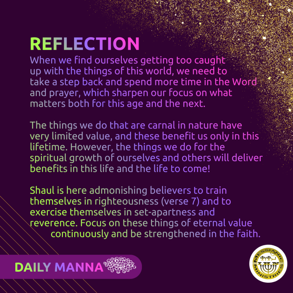 For physical exercise is of limited value, but set-apartness is valuable in every way, holding promise for the present life and for the one to come.