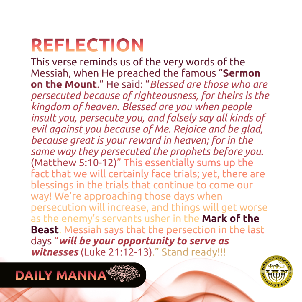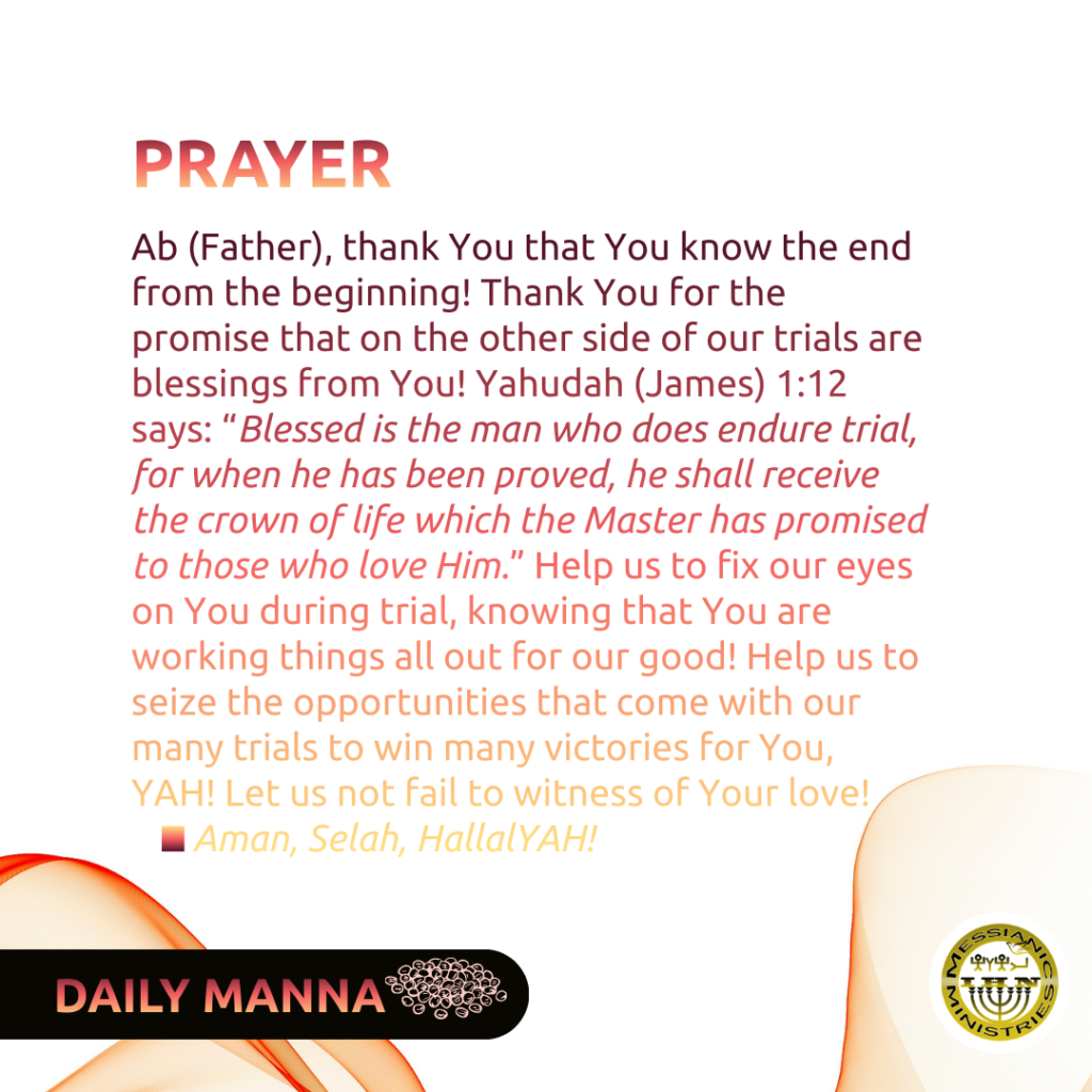 Did you hear what Ya‛aqoḇ (James) 1:2 says: “Consider it pure joy, my brethren, when you encounter trials of many kinds…” Firstly, the walk in Messiah is one of “many trials” – not one, not a few, but many! Knowing this fact positions you in the right mindset, that you will have constant battles – not smooth sailing! When you see these trials unfold in your life, don’t despair. It is normal. Better yet, you have the power, through the Set Apart Spirit, to succeed in confronting these trials. After all, “No trial has seized you except what is common to man. And Alahym is faithful; He will not let you be tried beyond what you can bear. But when you are tried, He will also provide an escape, so that you can stand up under it (1 Co 10:13).” Here, we learn that without a shadow of a doubt, the Father, the Most High, YAHUAH, has a plan!!! He has made a way for us to escape. If you don’t see it yet, don’t worry. Stay tuned for the big reveal!